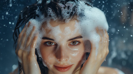 A woman applies shampoo to her hair in the shower, surrounded by bubbles and water droplets, showcasing a moment of relaxation and beauty routine.