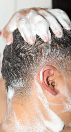 Young man relaxing in bath washing hair and face with soap and eyes closed