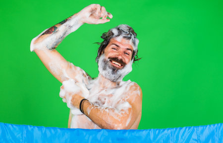 Bearded hipster man with long beard and moustache. Taking bath with soap suds. Bath procedures and grooming.