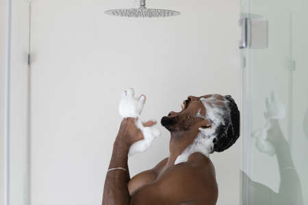 Angry soapy African American young man with white shampoo foam on hair dissatisfied by broken shower, screaming, standing in bathroom, problem with suddenly turned off hot or cold water