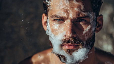A close-up of a man shaving with thick foam on his face, detailed stubble and cinematic warm tones.