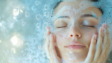 A woman bathing and washing her face with water, air bubbles floating around. The concept of cleanliness and relaxation. Copy space available.
