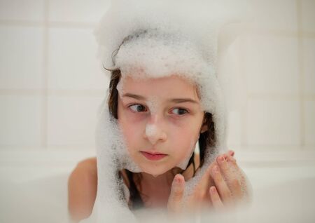 Young girl inside the bath. A little girl bathes in a bathtub with foam. A girl of 9 years old takes a bath. Purity concept