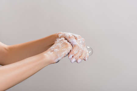 Child lathers his hands with soap close-up on a white background. Hygiene concept. Disease prevention, health care, body care. Virus protection. Pandemic, covid-19.