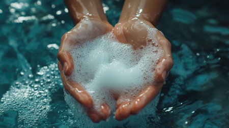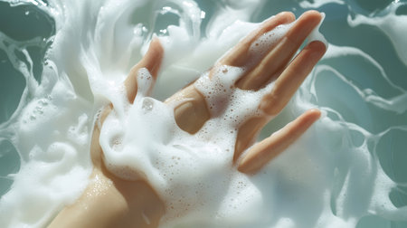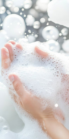 Soapy Hands Enveloped in Soft White Bubbles Cleanliness and Self Care.
