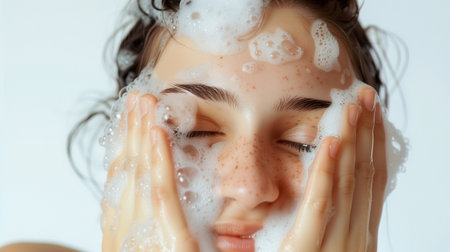 Close-up of a teenager enjoying their morning routine by washing their face with foaming cleanser, resulting in playful bubbles and a refreshed expression.