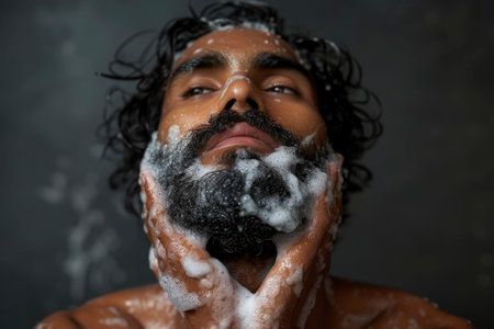 Close-up portrait of a man with a beard covered in foam, captured in dramatic lighting, emphasizing texture and rugged masculinity.