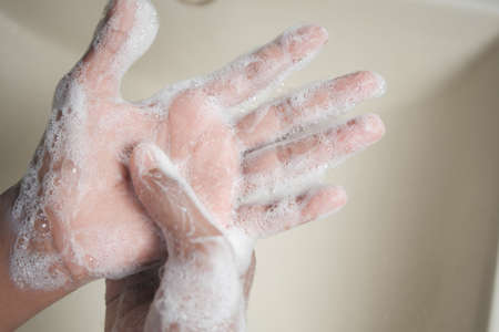 Close up Male hands washing hands with soap. for corona virus prevention.
