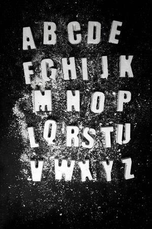 The letters of the English alphabet are placed on the table in any order. The concept of reading books in English. Literacy and education. Latin letters are highlighted from the upper corner.
