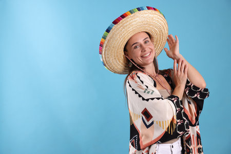 Beautiful Mexican woman smiling wearing Mexican Hat in the traditional dress