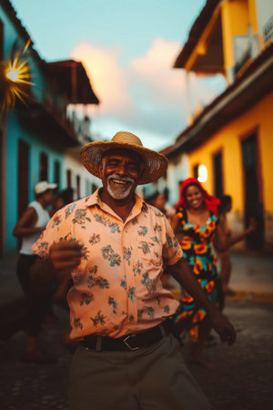 Lively street celebration in Latin American town during the evening. Joyful man in straw hat and floral-patterned shirt and group pf people behind dancing