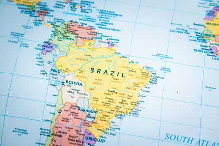 Close-up of the country word Brazil on a world map with the detailed name of the capital city.