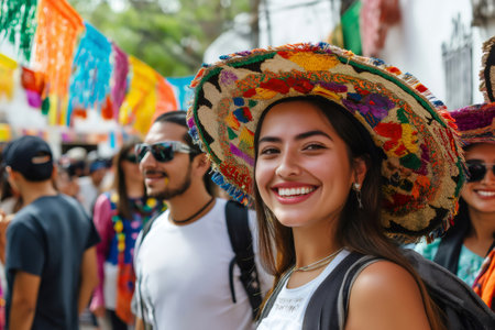 Young woman smiling while wearing a vibrant sombrero and enjoying time with friends at a lively Mexican street market