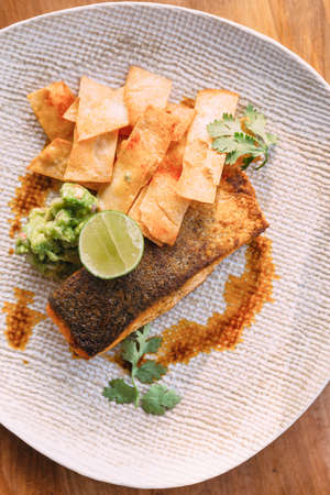Grilled well done salmon steak served with pistachio sauce and sliced lime topping with fried sticks.