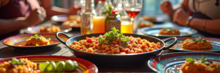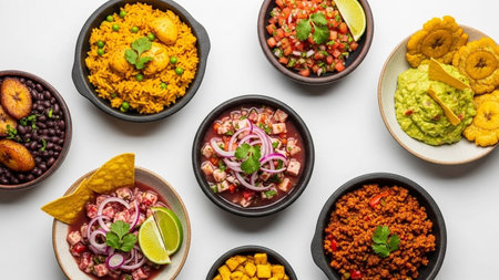 Caribbean cuisine, Traditional assorted dishes, Top view.