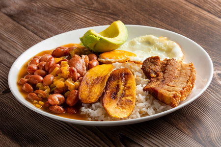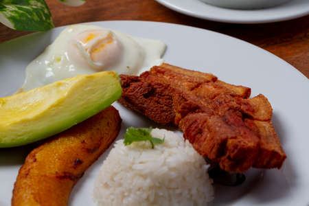 Ceramic plate with fried egg fried pork avocado and ripe plantain for traditional Colombian breakfast