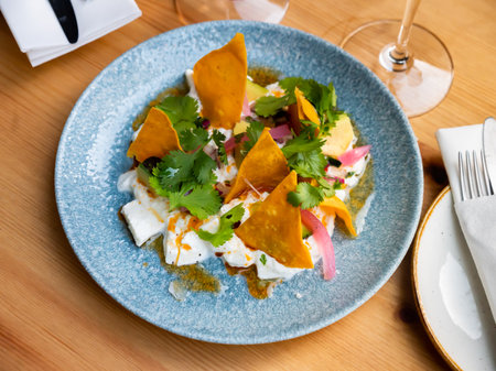 Tasty Mexican salad with smoked chicken and corn chips with copy space