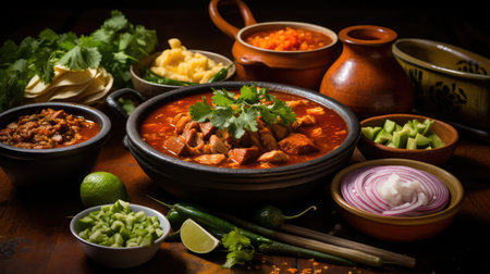 A closeup of a bowl of Mexican soup with avocado, cilantro, red onion, and lime. The soup has a vibrant red color and is garnished with fresh herbs and vegetables.