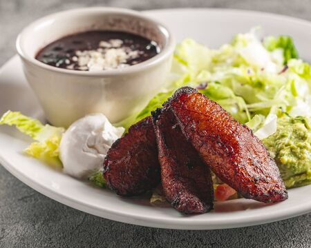 Beautifully plated mexican meal of plantains platanos beans sour cream lettuce on white plate on a grey surface on a black background