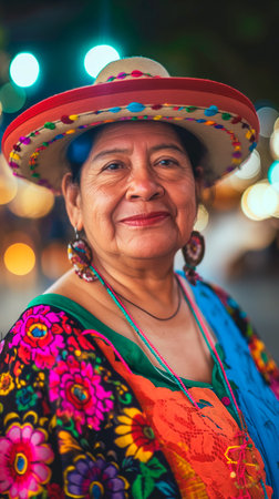 Vibrant Traditional Mexican Costume: Smiling Woman in Sombrero and Colorful Dress