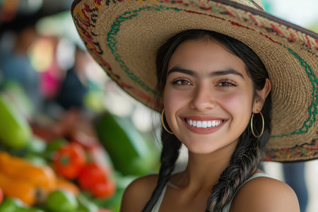 Portrait of a cheerful Mexican craftswoman wearing a vibrant, handcrafted hat, representing rich cultural heritage