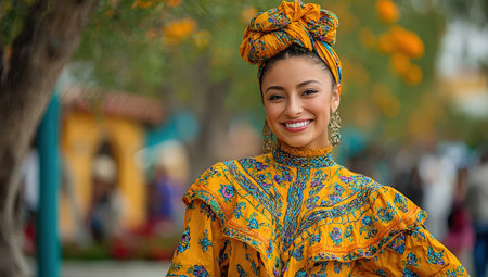 Female wearing bright yellow traditional attire and headwrap smiles in a lively outdoor environment, reflecting cultural pride and happiness
