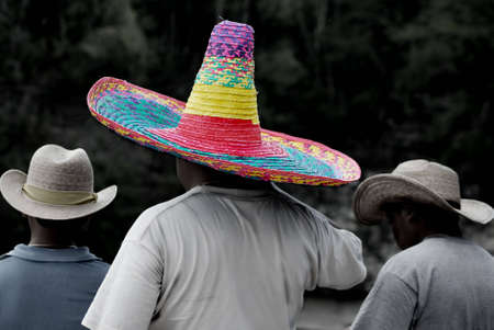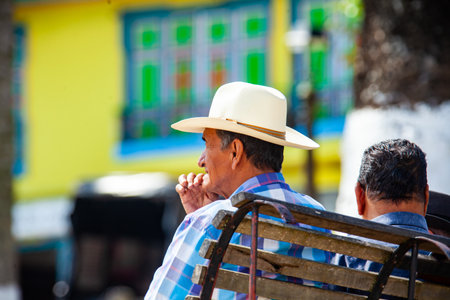 AGUADAS, COLOMBIA - JANUARY 15, 2024: Local senior men at the central square of the heritage town of Aguadas wearing the traditional Aguadeño hat located at the Caldas department in Colombia.