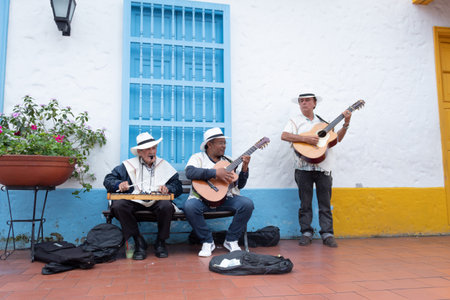 Medellin, Colombia - July 30, 2022: A trio of elderly traditional Colombian musicians playing music in the street. One of them playing a xylophone and the other two a guitar