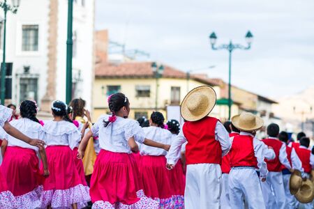 Cusco, Peru. June 25, 2023. parade of typical dances in the cathedral of Cusco by the Inti Raymi.