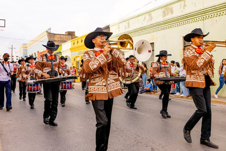 Matamoros, Tamaulipas, Mexico - February 25, 2023: Fiestas Mexicanas Parade, Music Band Halcones from the Ricardo Flores Magon High School, performing at the parade