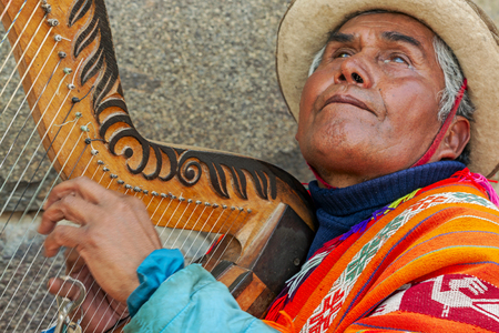 Cusco, Peru - August 31, 2019: Blind musician from Cuzco playing melodiously his harp for the enjoyment of tourists in the city of Ollantaytambo