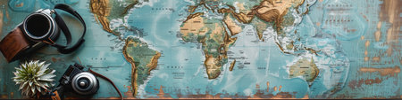 Travel adventures displayed on a world map backdrop with camera and travel gear. Generative AI