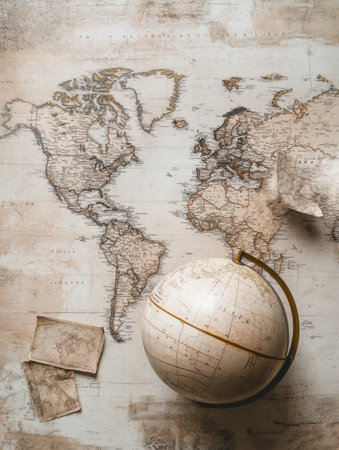An antique globe sits on a textured vintage background featuring a detailed world map and old maps surrounding it backkoning exploration.