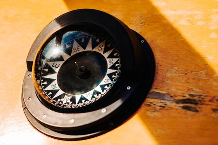 Modern nautical metal tourist compass on a blue background. travel or search concept