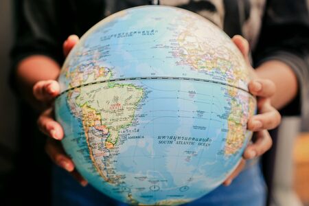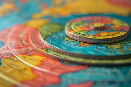 A colorful globe rests on a circular metallic base, highlighting various countries. The setting features a blurred background suggesting an artistic environment, illuminated by natural light.