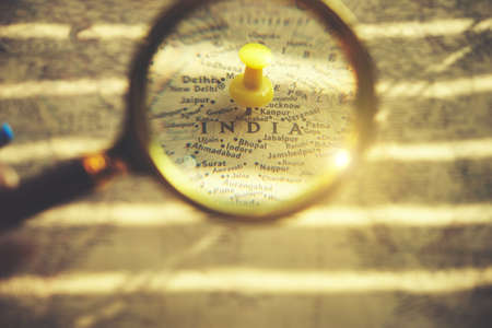 India on old map is viewed with magnifying glass, light breaks through blinds
