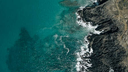 Aerial drone view of the ocean waves breaking on the rocky shore