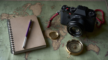 A flat lay composition featuring a vintage camera, a notebook with a pen, a compass, and a map, evoking a sense of adventure and exploration.