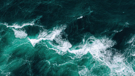 An intense overhead perspective of a stormy sea. Dark emerald green water churns, creating powerful white waves and foam, forming a dynamic and abstract natural texture.