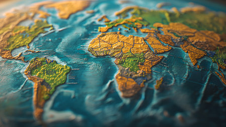 This image highlights a close-up view of a textured world map featuring vibrant colors and detailed relief. The continents are distinctly molded, showcasing geographical features and political boundaries. The atmosphere evokes curiosity and exploration, inviting viewers to engage with global geography and cartography.