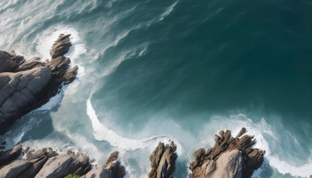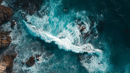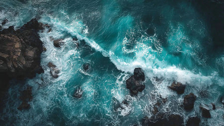 Aerial drone view of ocean waves crashing on the rocks. Top view