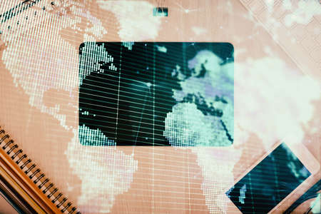 Double exposure of business theme hologram over desktop with phone. Top view. Mobile international trade connection concept.