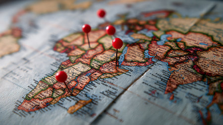 Close-up of colorful pushpins on a vintage world map, symbolizing travel planning and exploration. Shadows add depth to the geographic details.