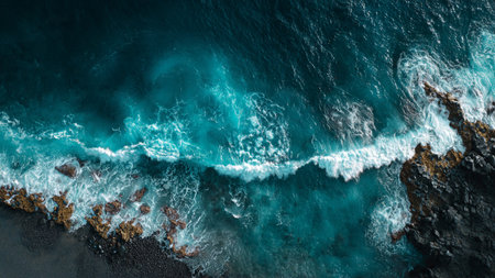 Aerial view of ocean waves crashing on black sand beach. Top view
