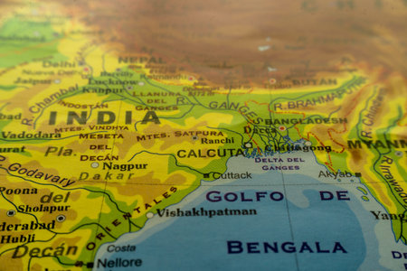 Close-up orographic map of Bangladesh, Ganges delta and Northwest India, with references in Spanish. Concept cartography, Travel, geography. Differential focus.