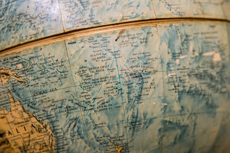 Old Used Geography Globe or Planet Sphere Model Repair with Patch Adhesive Tap, Close Up at Asia and Australia Continent.