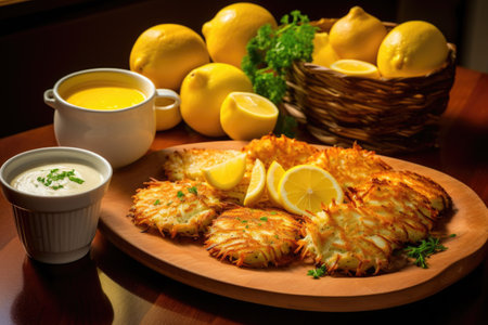 potato pancakes fried in oil on large griddle for delicious gourmet lunch, created with generative ai