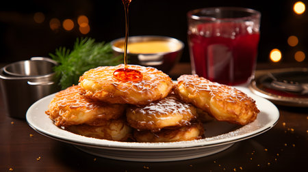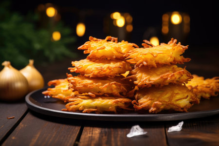close-up of golden latkes against a dark wooden backdrop, created with generative ai
