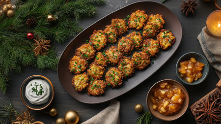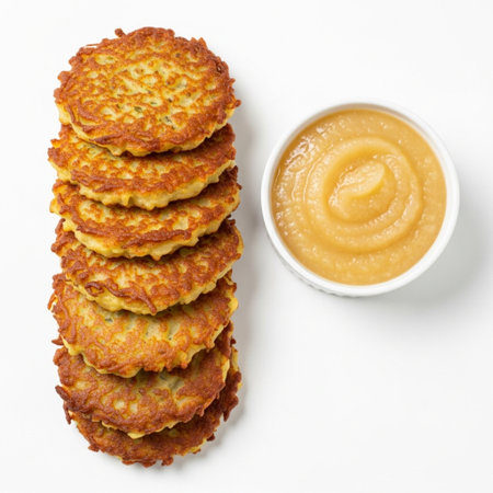 a plate of latkes with apple sauce and sour cream, created with generative ai