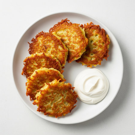 Potato pancakes with sour cream on a white background, top view